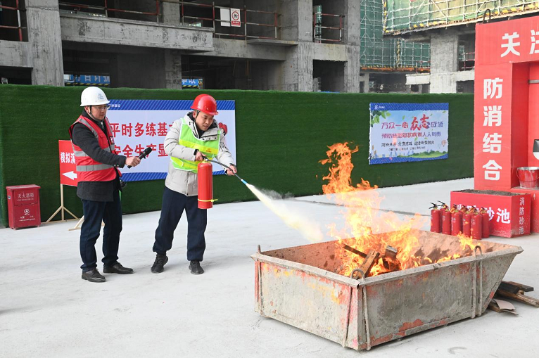 水街南區(qū)項(xiàng)目經(jīng)理王明亮結(jié)合引發(fā)火災(zāi)因素、具體危害、處置方式三個(gè)方面進(jìn)行了消防知識(shí)宣講。“10號(hào)樓3層發(fā)生火災(zāi),還有作業(yè)人員被困...”講機(jī)里傳來火情,演練正式拉開帷幕,各小組迅速展開行動(dòng),滅火組手持滅火器進(jìn)入“火場”拔、握、瞄、掃動(dòng)作熟練撲滅大火。疏散組通過喊話器疏散樓內(nèi)被困工人,防止造成二次踩踏事故,并救出傷員,“火情”得到有效控制。工程部田豐鳴對(duì)滅火器的使用進(jìn)行了現(xiàn)場教學(xué),各部門負(fù)責(zé)人參與實(shí)操。