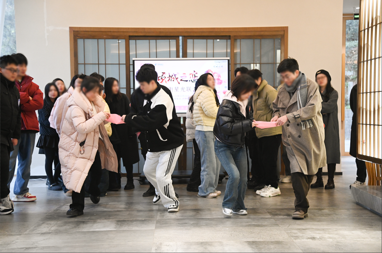 破冰環(huán)節(jié)成為拉近彼此距離的關(guān)鍵一步,青年們根據(jù)手中的號(hào)碼牌,尋找對(duì)應(yīng)的另一半,兩兩相對(duì)而坐,開(kāi)啟了真誠(chéng)的自我介紹。簡(jiǎn)單的問(wèn)候、真摯的分享,讓原本陌生的氛圍逐漸升溫,默契在不經(jīng)意間悄然滋生,為后續(xù)的互動(dòng)奠定了良好基礎(chǔ)。趣味十足的游戲環(huán)節(jié)更是將活動(dòng)氛圍推向高潮。“幸福接力” 游戲中,男女嘉賓協(xié)作配合,用 A4 紙小心翼翼地傳遞乒乓球,過(guò)程中既有緊張刺激的比拼,又有歡聲笑語(yǔ)的互動(dòng),大家在協(xié)作中增進(jìn)了解、加深信任;“聽(tīng)曲識(shí)歌” 環(huán)節(jié),經(jīng)典旋律響起,青年們踴躍搶答,展現(xiàn)出豐富的音樂(lè)儲(chǔ)備,臺(tái)下掌聲與喝彩聲不斷;“你比我猜” 游戲則考驗(yàn)著搭檔間的默契,夸張的肢體動(dòng)作與巧妙的語(yǔ)言提示相映成趣,現(xiàn)場(chǎng)充滿了歡樂(lè)的氣息。一系列精心設(shè)計(jì)的游戲,讓青年們?cè)谳p松愉悅的氛圍中徹底放下拘謹(jǐn),盡情釋放活力,陌生感逐漸消散,情誼在互動(dòng)中悄然升溫。