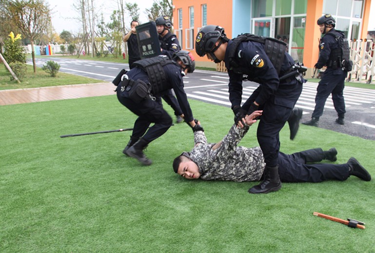 隨即,幼兒園保安和特巡警員共同進(jìn)行了恐怖襲擊場(chǎng)景模擬。忽然,一名持斧頭的男子試圖闖進(jìn)幼兒園來,大聲嚷嚷著要報(bào)復(fù),還拿著斧頭四處揮舞,危險(xiǎn)一觸即發(fā)。一鍵報(bào)警的東北派出所警車呼嘯趕到,全副武裝的民警果斷出擊,經(jīng)過一番搏斗將"歹徒"成功制服,將其押上了警車。